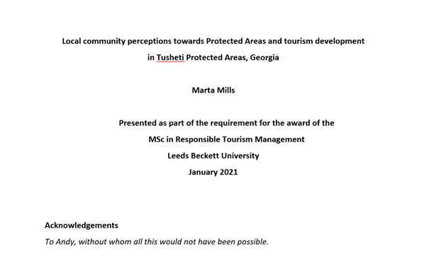 This qualitative, organization-based research, conducted in close cooperation with the Caucasus Nature Fund (CNF), sought to explore the residents’ perceptions on the benefits and costs of the establishment of the Protected Area and subsequent tourism development in Tusheti Protected Areas (Tuheti PAs) in Georgia. The non-economic values were also explored. Understanding the resident’s perceptions and values was essential to developing practical recommendations to support positive community-Park relationship and responsible tourism, to enhance biodiversity conservation efforts for the CNF and its stakeholders.